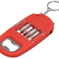 Брелок включает в себя 2 плоские и 2 крестообразные насадки, прочную металлическую открывалку и небольшой фонарик. Корпус сделан из плотного пластика с мягким покрытием soft-touch. Встроенный фонарик позволяет подсвечивать рабочую зону.