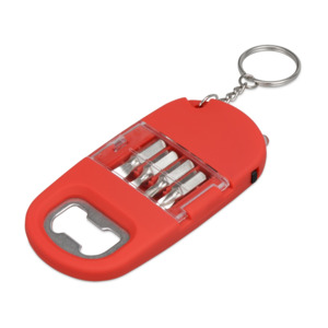 Брелок включает в себя 2 плоские и 2 крестообразные насадки, прочную металлическую открывалку и небольшой фонарик. Корпус сделан из плотного пластика с мягким покрытием soft-touch. Встроенный фонарик позволяет подсвечивать рабочую зону.