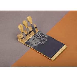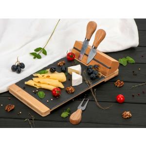 Набор для сыра из сланцевой доски и ножей предназначен для нарезки и подачи разных сортов сыра и других закусок. Доска легко извлекается из подставки и может быть использована для красивой подачи. В набор входят: - бамбуковая подставка с магнитной полосой для крепления приборов, - разделочная доска из сланца, - листовидный нож, - вилка для сыров, - нож для твердого сыра.