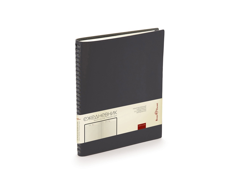 Недатированные деловой ежедневник «Tintoretto». Реальный шов по периметру в цвет материала Гибкий мягкий материал обложки прекрасно подходит для нанесения тиснения. Ежедневники выпускаются в формате В5, его размеры составляют 185 х 230 мм. Блок - 136 листов соединен полускрытым металлическим гребнем. Для блока используется высококачественная бежевая бумага, обладающая плотностью 70 грамм. В начале ежедневника расположены страницы со справочным материалом.