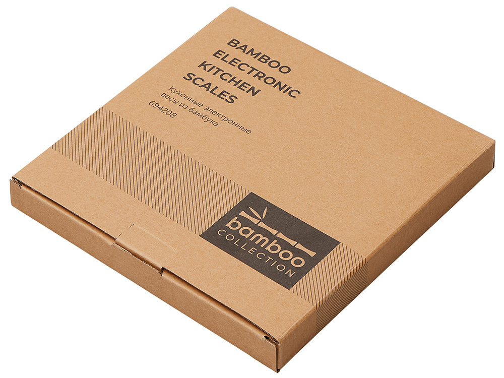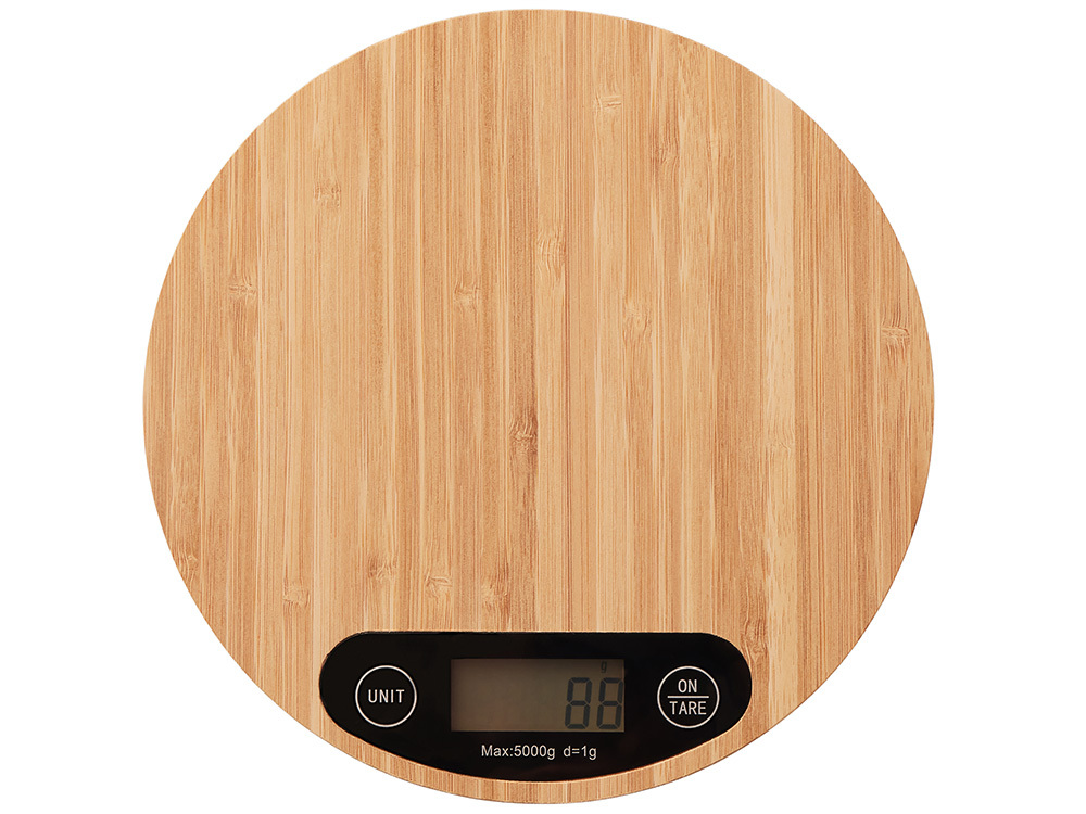 Кухонные весы – незаменимый аксессуар, который пригодится тем, кому часто приходится соблюдать точные пропорции. Платформа изготовлена из натурального бамбука. Этот материал отлично отталкивает влагу и предотвращает распространение бактерий. Лаконичный внешний вид позволяет весам вписываться в любой интерьер. • Датчики высокой точности гарантируют корректность взвешивания; • минимальная нагрузка – 1 г, а максимальная – 5 кг; • точность измерения – 1 г; • функция сброса веса тары позволяет один за другим взвешивать ингредиенты без учета массы посуды; • автоматическое отключение; • присутствуют индикаторы низкого заряда батареи и перегрузки; • можно свободно переключаться между граммами, фунтами, унциями, миллилитрами и жидкими унциями; • работа от двух батареек 1.5V AAA. На кухонные весы "Scale" можно нанести логотип компании, и тогда они будут не только радовать владельца своей функциональностью, но и повышать узнаваемость фирмы.