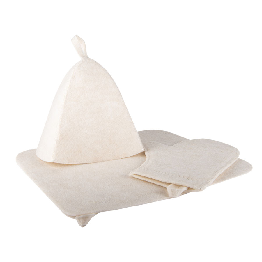 Расширенный классический набор для сауны из лавсана – коврик, шапочка и рукавица из искусственного войлока. Коврик убережет от ожогов в сауне, шапочка предотвратит тепловой удар и не позволит высокой температуре и влажности испортить волосы, а рукавица не позволит вам обжечься паром.