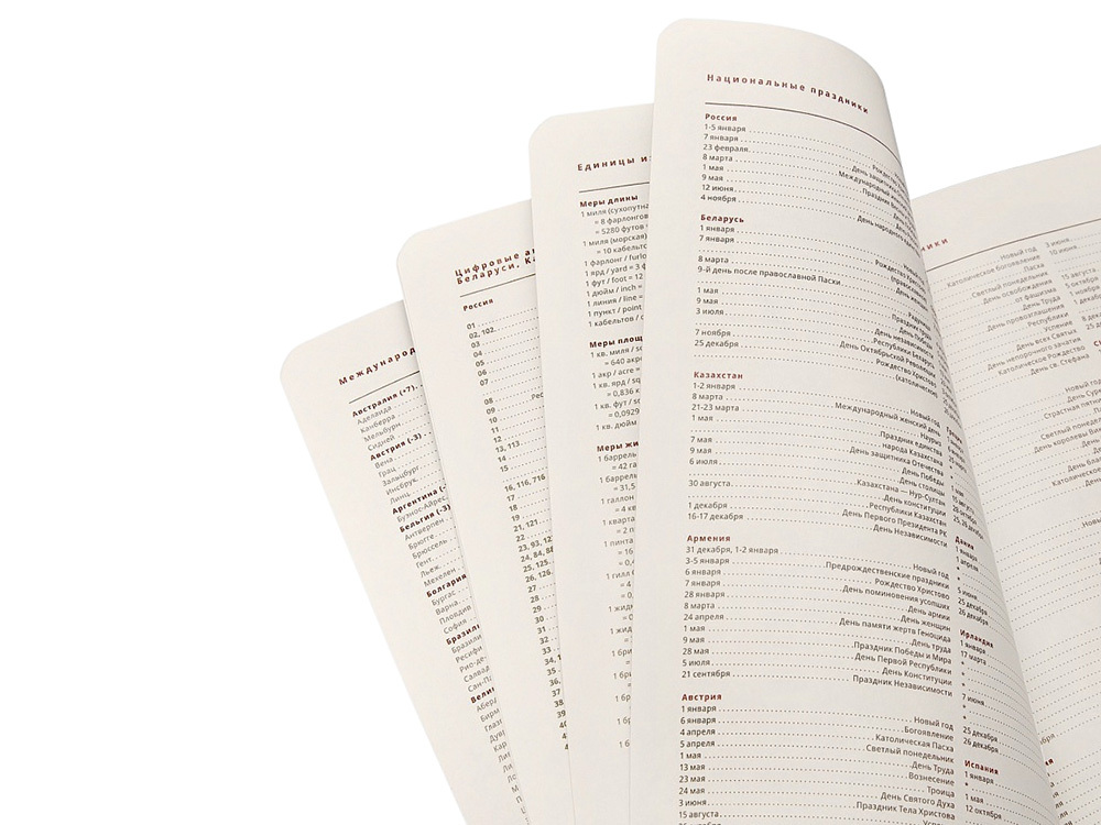 Недатированный ежедневник «PARLIAMENT» формата A5 в твердом переплете – элегантный деловой аксессуар, подчеркивающий статус владельца с продуманным до мелочей функционалом: - твердая обложка из высококачественной экокожи с декоративной нитью по периметру в тон ежедневника; - золотой срез, контрастирующий с цветом обложки; - скругленные перфорированные углы блока и двойное ляссе для удобства навигации; - внутренний блок с увеличенным количеством страниц - 352, содержит несколько разделов: - страница для персональных данных; - раздел справочной информации на 17 страницах (часовые пояса, аэропорты Европы, международные телефонные коды, размер одежды, телефонные коды России, Беларуси, Казахстана, Армении, цифровые автомобильные коды, римские цифры, расход калорий при физической нагрузке, формат бумаги, десятичные приставки, единицы измерения, греческие буквы, штрихкоды, время распада алкоголя в крови, города-миллионники, национальные праздники, термины международной торговли, температура, скорость, давление, буквенные коды стран, энергетическая и питательная ценность продуктов, страны мира, заметки); - раздел для планирования с разлинованными листами и указанием времени с интервалом в один час; - картонный слив-бокс.