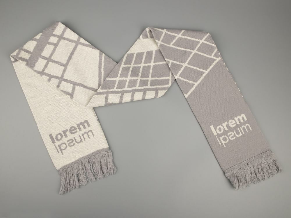 Шарф с вывязанным логотипом и индивидуальным рисунком в фирменной цветовой гамме.