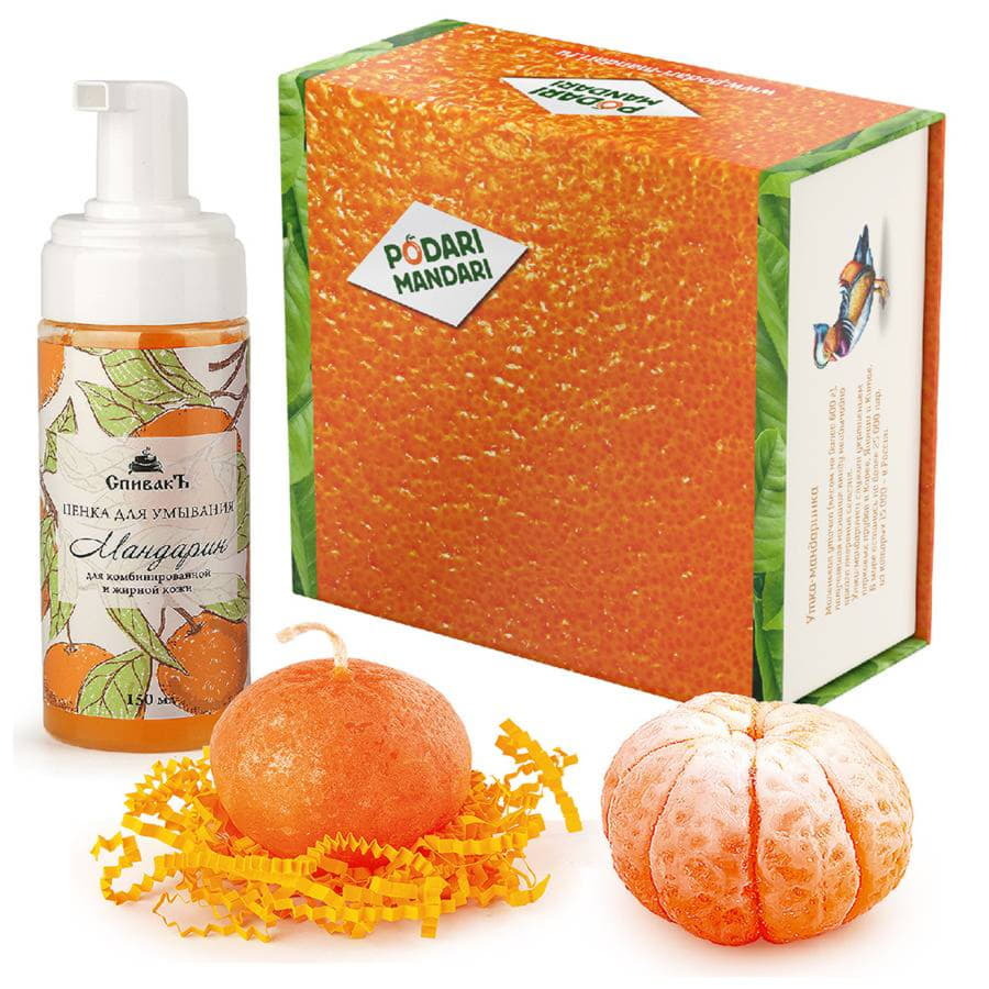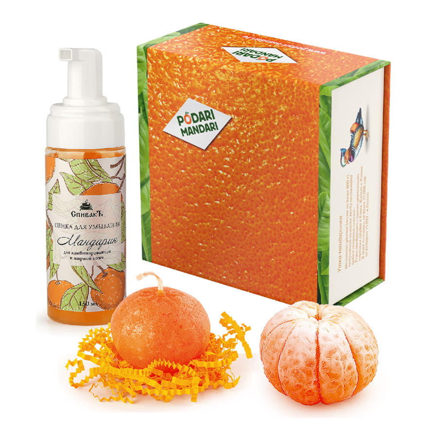 Набор Podari Mandari "Мандариновое настроение" Набор из 3 необычных мандаринов создаст позитивное настроение и будет долгое время радовать вас своими натуральными запахами. ароматное мыло ручной работы в виде очищенной мандаринки, свеча ручной работы в форме целого мандарина и мандариновая пенка для умывания вызывают неподдельный восторг своими натуральными формами, а качество данных продуктов не вызывает лишних вопросов. Эфирное масло мандарина в составе средств для умывания освежает и тонизирует кожу, помогает выровнять цвет лица и улучшить кровообращение. Подходит для всех типов кожи, но в первую очередь – для комбинированной и жирной. Образует густую обильную пену, тщательно очищает кожу. Все товары сертифицированы и безопасны. На упаковке рассказывается о разных видах цитрусов и их отличиях, об истории слова «мандарин» и даже о том, кто такая утка-мандаринка Дополнительно к набору можно приобрести эффектный мандариновый подарочный пакет. Размер набора (см): 15 х 15 х 6,5 Вес брутто набора: 550 г Вес нетто пенка для умывания: 150 г Вес нетто мыло: 100-110 г Вес нетто свеча: 60 г Пенка для умывания "Мандарин": калиевые соли масла миндального, пальмового, кокосового, ши, вода, эфирное масло мандарина, сосны. Мыло глицериновое ручной работы "Мандарин большой": вода, глицерин, пропилен гликоль, стеврат натрия, лаурат натрия, сорбитоп, лауретсульфат натрия, стеариновая кислота, лауриновая кислота, отдушка косметическая, пигмент косметический. Свеча "Мандарин": парафин, краситель, ароматизатор, хлопчатобумажная нить.