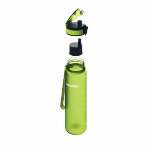 Матовое бархатистое покрытие бутылки приятно на ощупь, широкий ремешок дополнительно фиксирует бутылку во время использования, защитный колпачок не даст воде пролиться в сумке.