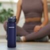 Матовое бархатистое покрытие бутылки приятно на ощупь, широкий ремешок дополнительно фиксирует бутылку во время использования, защитный колпачок не даст воде пролиться в сумке.