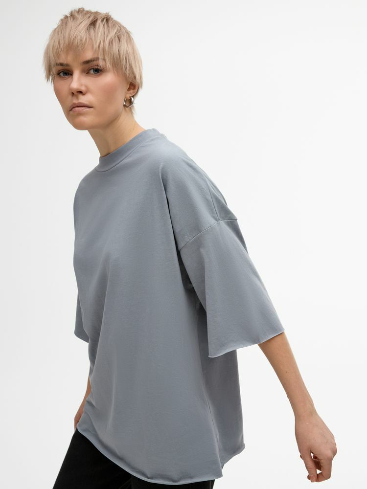 Футболка унисекс свободного кроя со спущенным плечом.