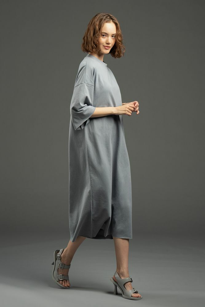 Платье свободного кроя со спущенным плечом.