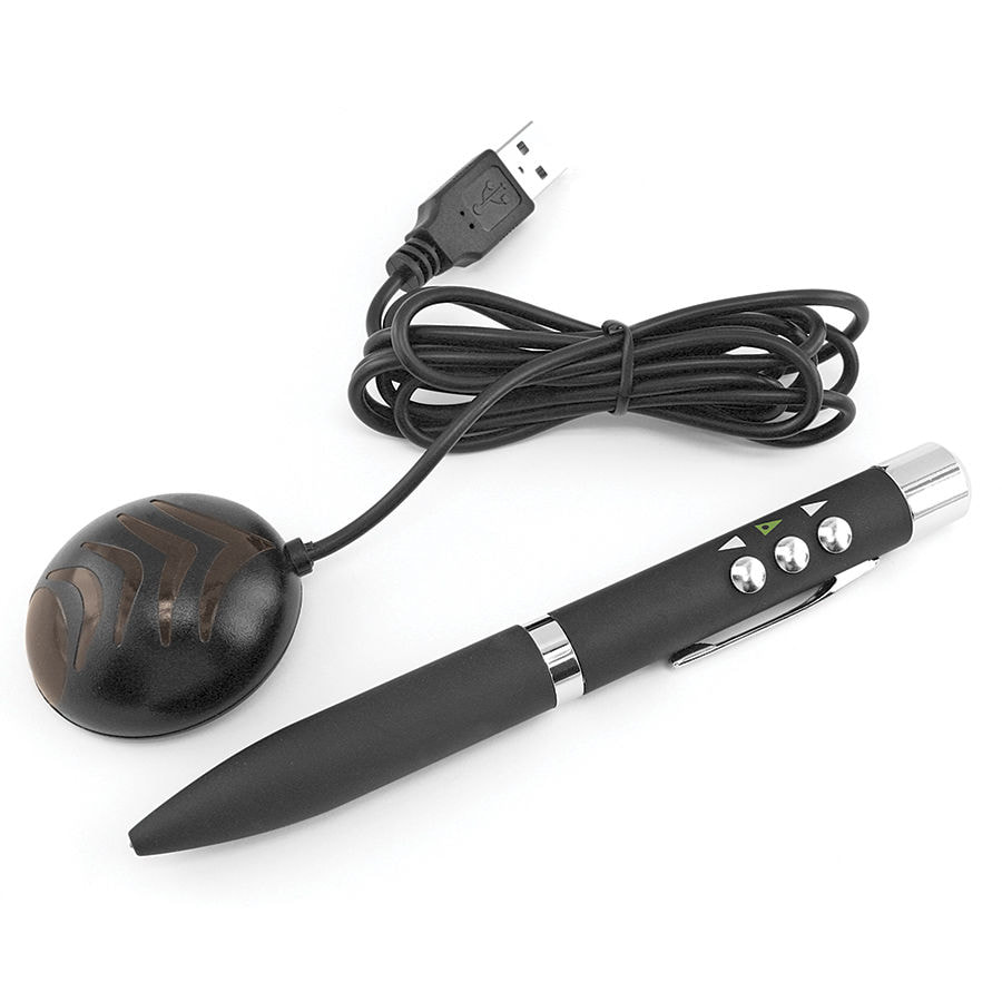 Приемник подключается к USB-порту компьютера. Угол передачи сигнала 45°, зона уверенного приема сигнала 15 м. Поддерживает программы Word, Excel, Power Point, ACDSee, Acrobat Reader и др. Красная лазерная указка.3 батарейки в комплекте к ручке.