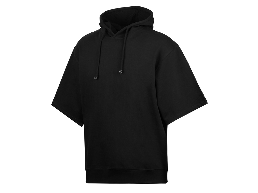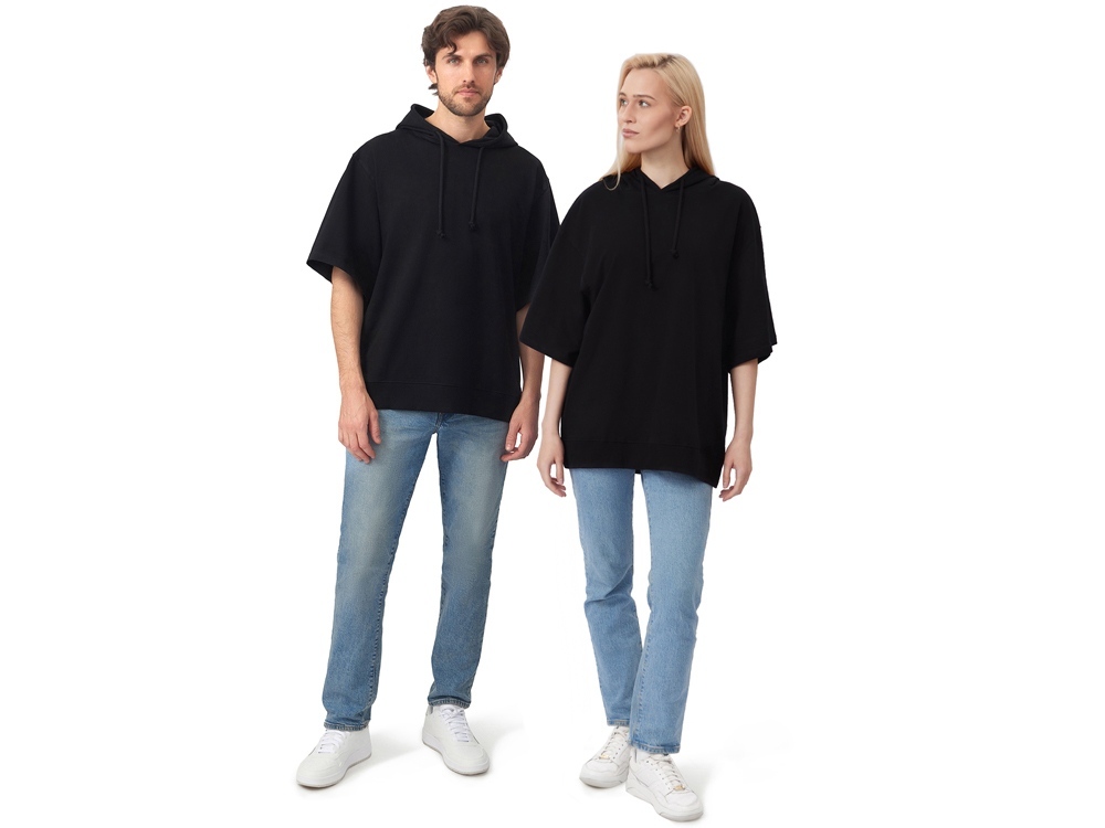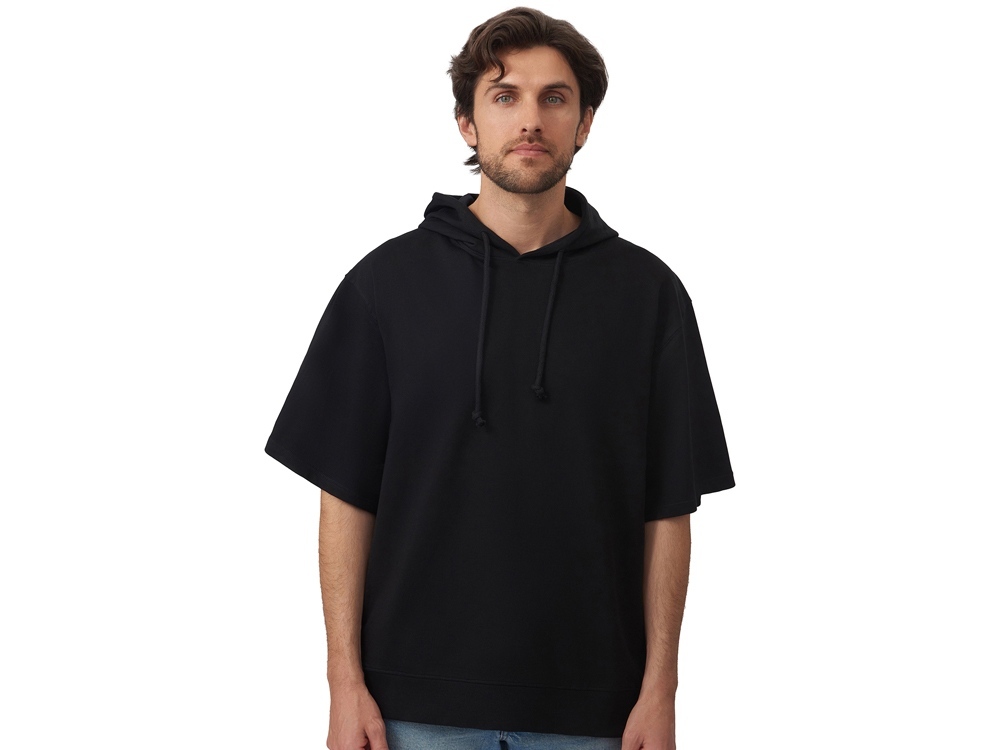 Худи с коротким рукавом выполнено из хлопкового френч терри с петельками на изнаночной стороне. Подкладка капюшона выполнена из основного полотна для объемной посадки. Модель комфортной и актуальной посадки оверсайз отлично подходит для обычной жизни и в качестве промо мерча. - оверсайз посадка - низ обработан рибом 2х2 и дополнительно отстрочен для укрепления - мягкое и качественное полотно френч терри - увеличенная зона для нанесения из-за отсутствия кармана