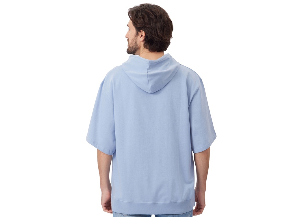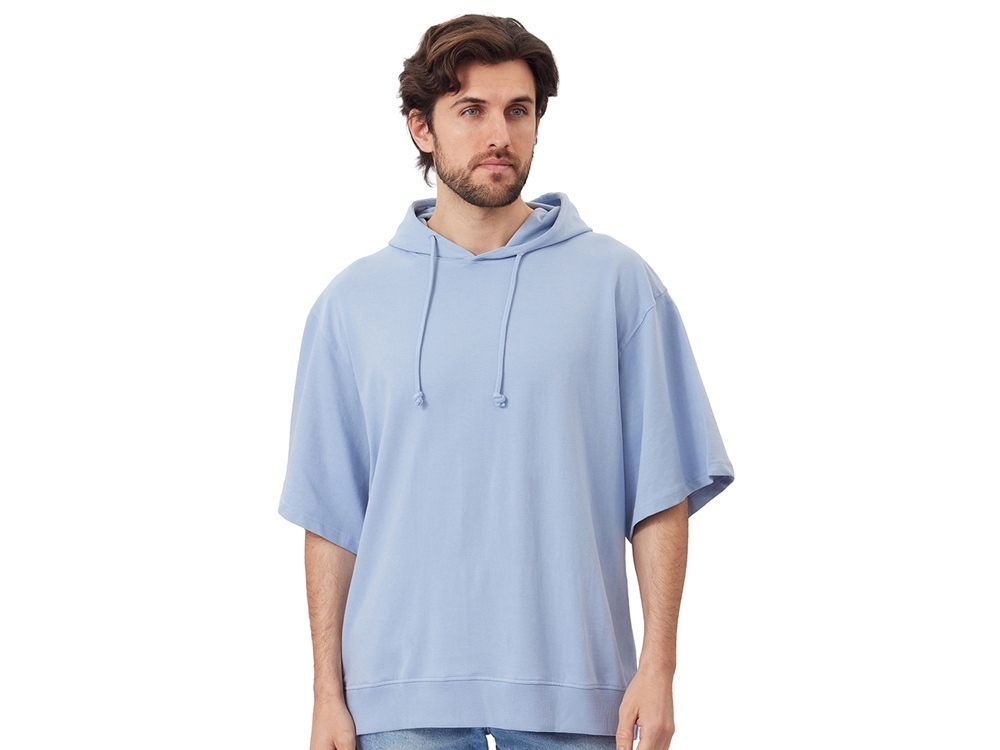 Худи с коротким рукавом выполнено из хлопкового френч терри с петельками на изнаночной стороне. Подкладка капюшона выполнена из основного полотна для объемной посадки. Модель комфортной и актуальной посадки оверсайз отлично подходит для обычной жизни и в качестве промо мерча. - оверсайз посадка - низ обработан рибом 2х2 и дополнительно отстрочен для укрепления - мягкое и качественное полотно френч терри - увеличенная зона для нанесения из-за отсутствия кармана