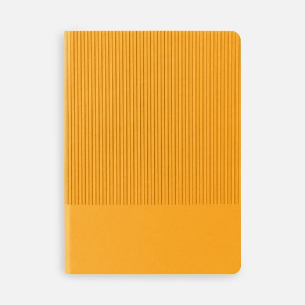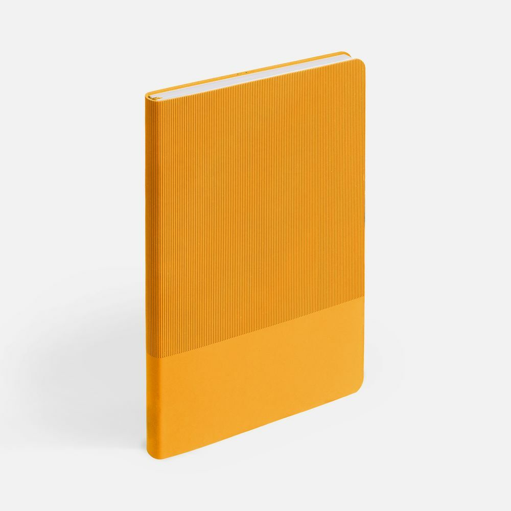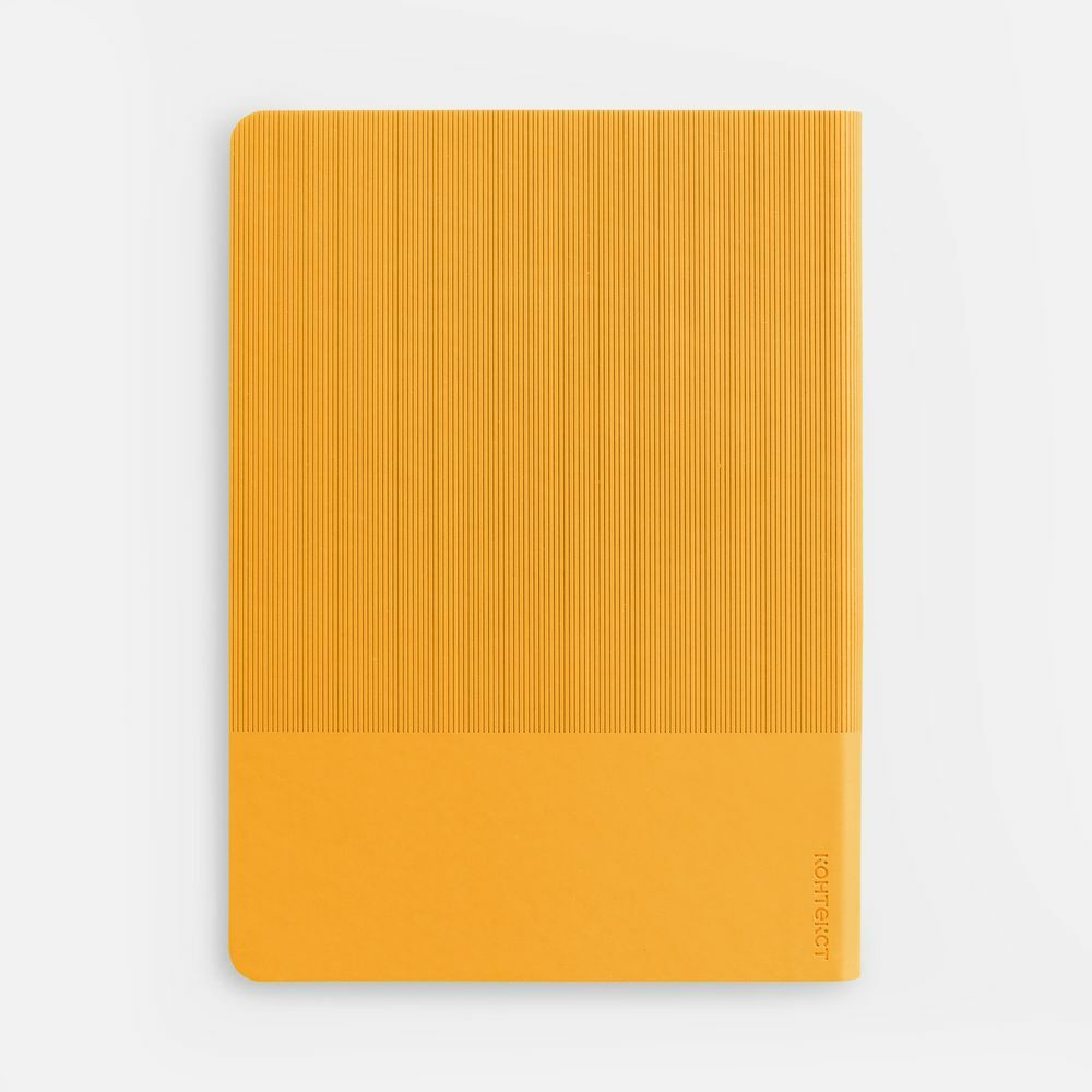 Ежедневник с гибкой обложкой выполнен из материала Soft Touch, желтый KK и Latte, желтый (внутренний материал); дополнен ляссе желтого цвета и фактурным тиснением обложки.