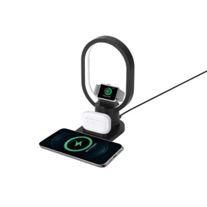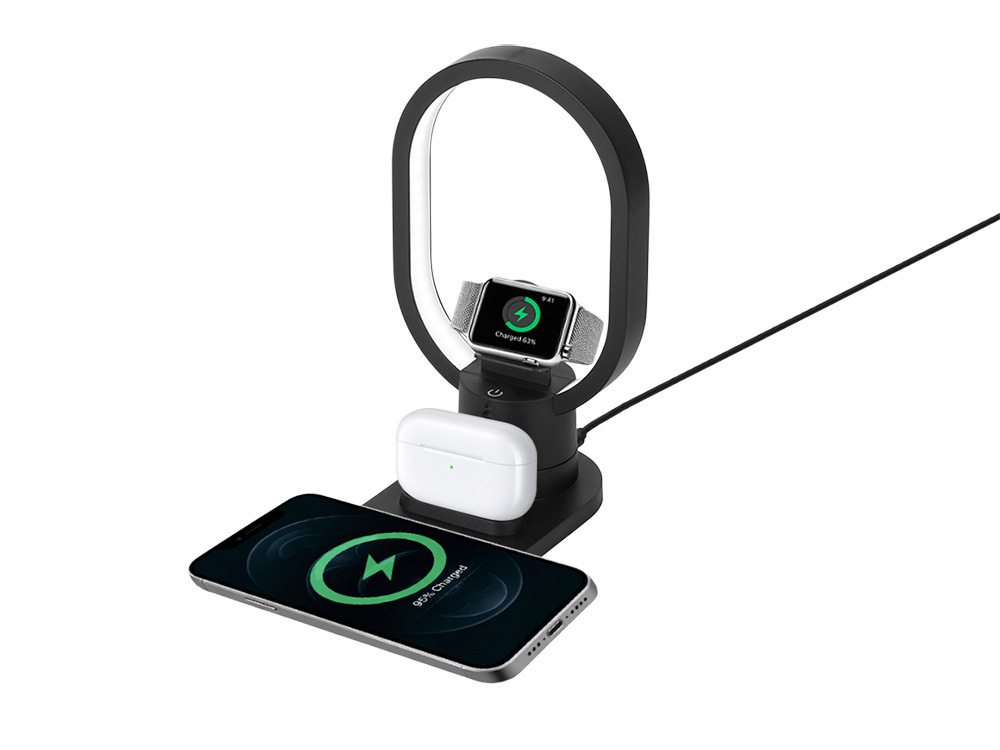 Настольная зарядная станция с лампой для трёх устройств - смартфона с поддержкой беспроводной зарядки, часов Apple и наушников Apple (разъем Lightning). Регулируемый уровень яркости (диммер). Лампу можно вращать вокруг своей оси. Для удобства транспортировки лампу можно отсоединить. • Быстрая беспроводная зарядка 15 Вт* • Одновременная зарядка 3-х устройств • Регулируемая яркость лампы • Многоуровневая интеллектуальная система защиты для безопасной зарядки *При подключении от сетевого адаптера 18 Вт