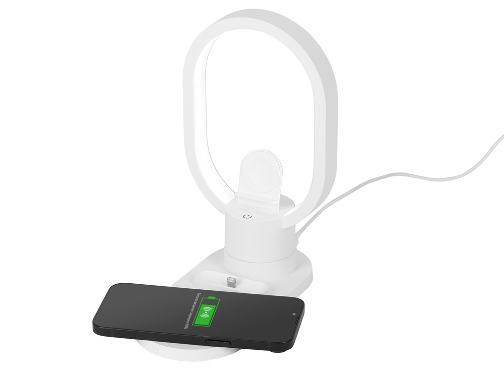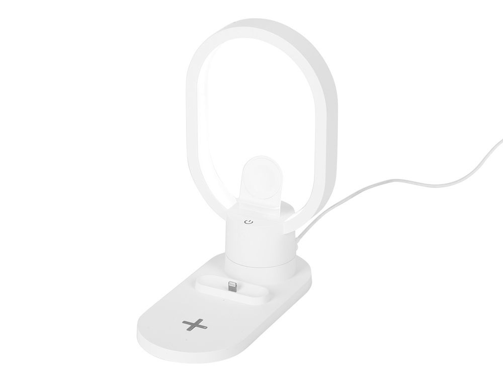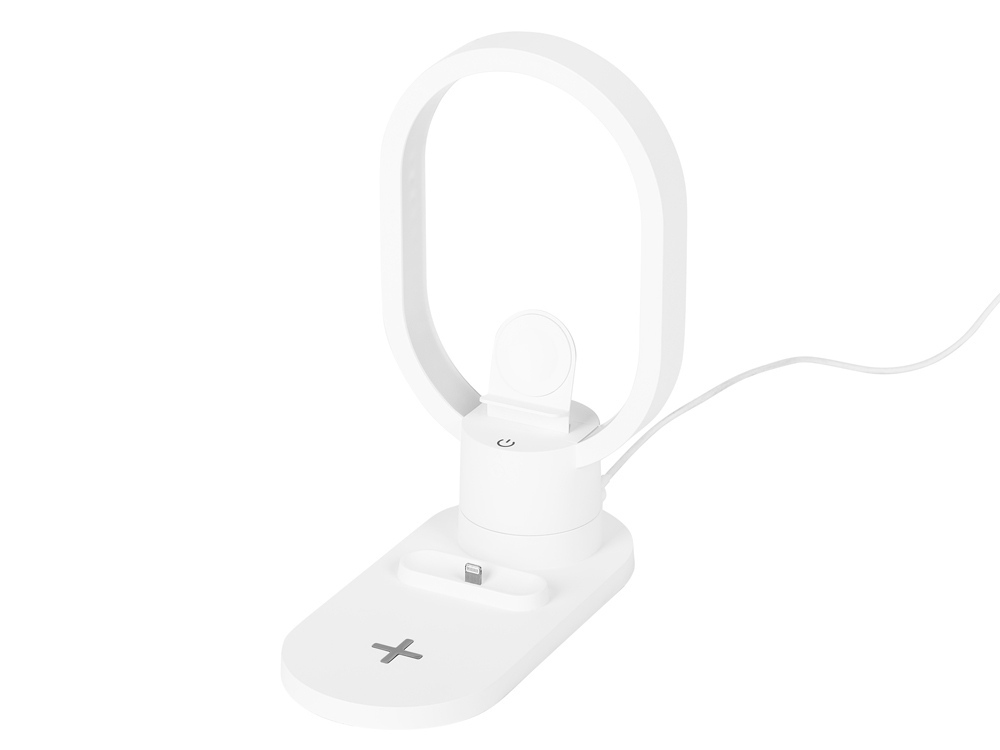 Настольная зарядная станция с лампой для трёх устройств - смартфона с поддержкой беспроводной зарядки, часов Apple и наушников Apple (разъем Lightning). Регулируемый уровень яркости (диммер). Лампу можно вращать вокруг своей оси. Для удобства транспортировки лампу можно отсоединить. • Быстрая беспроводная зарядка 15 Вт* • Одновременная зарядка 3-х устройств • Регулируемая яркость лампы • Многоуровневая интеллектуальная система защиты для безопасной зарядки *При подключении от сетевого адаптера 18 Вт