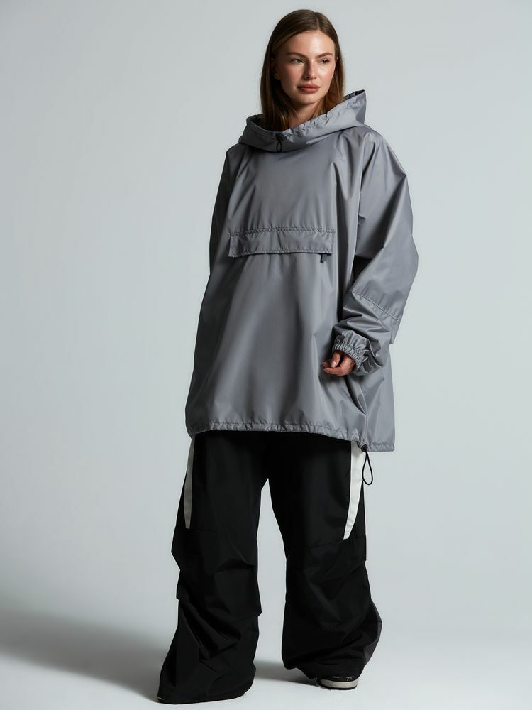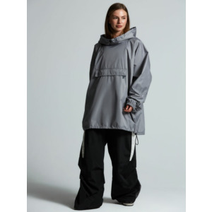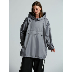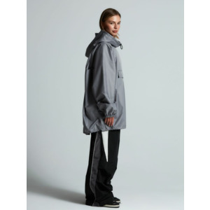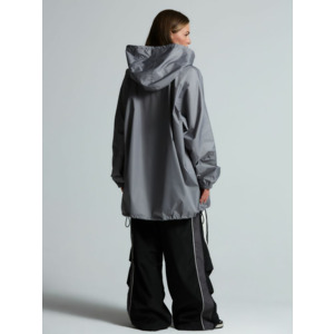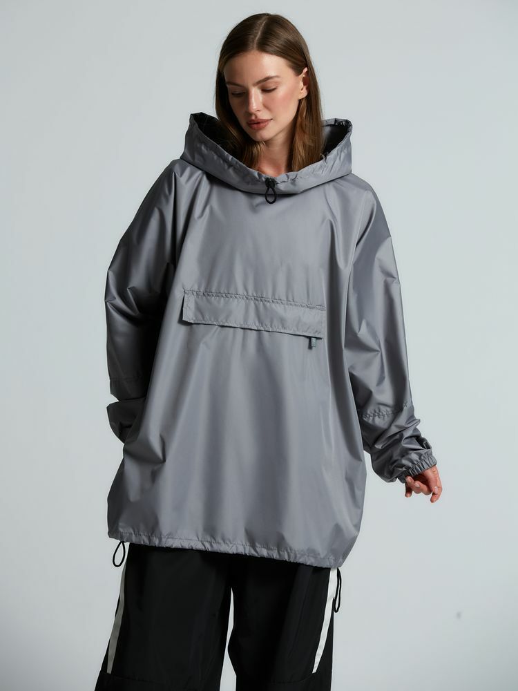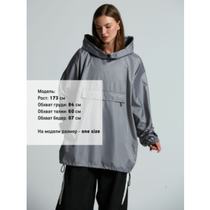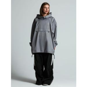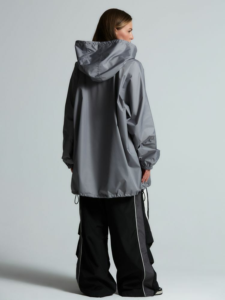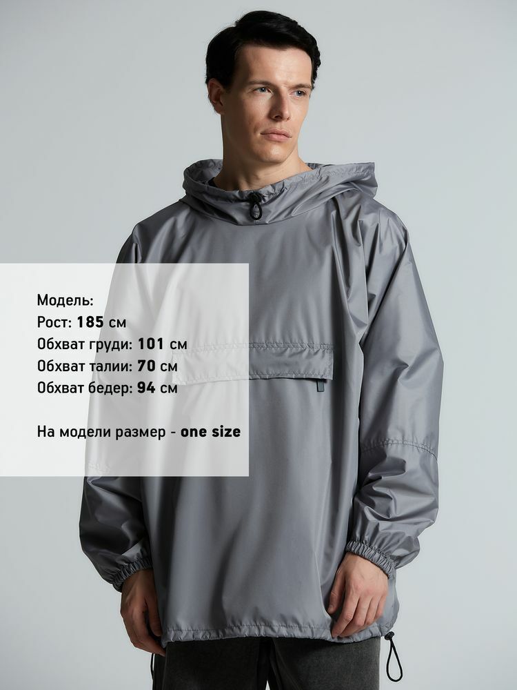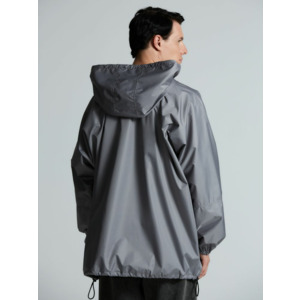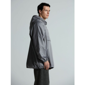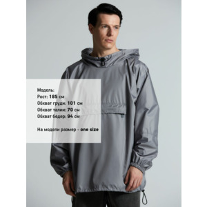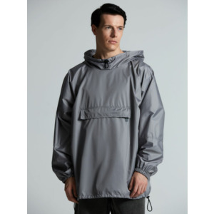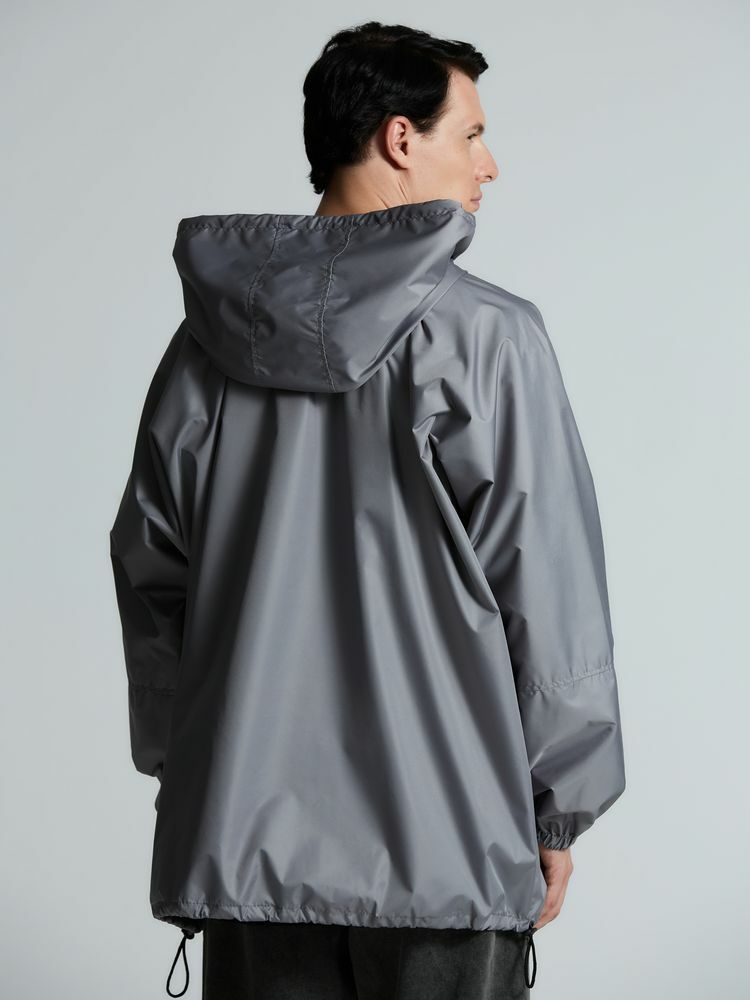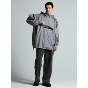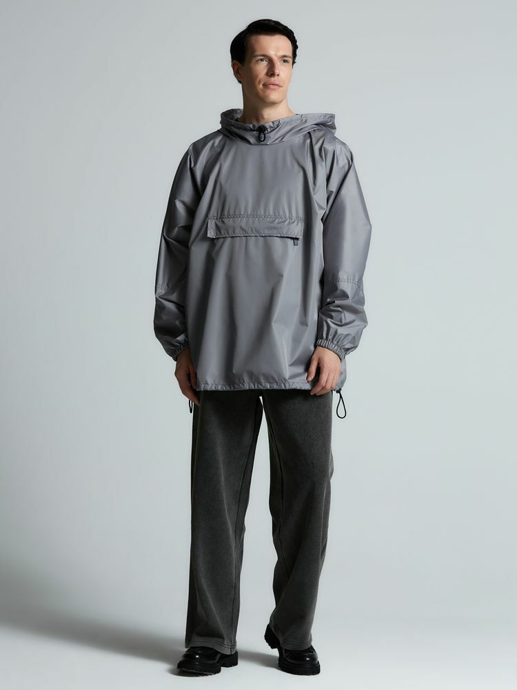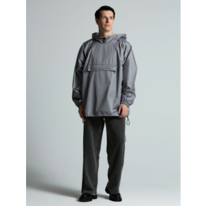 Дождевик-анорак с капюшоном и карманом на молнии спереди. Выполнен из ткани дюспо с матовой поверхностью — легкой, мягкой на ощупь, но устойчивой к повреждениям. Она не шелестит и практически не мнется. Благодаря пропитке дюспо обладает отличными водоотталкивающими и ветрозащитными свойствами.