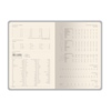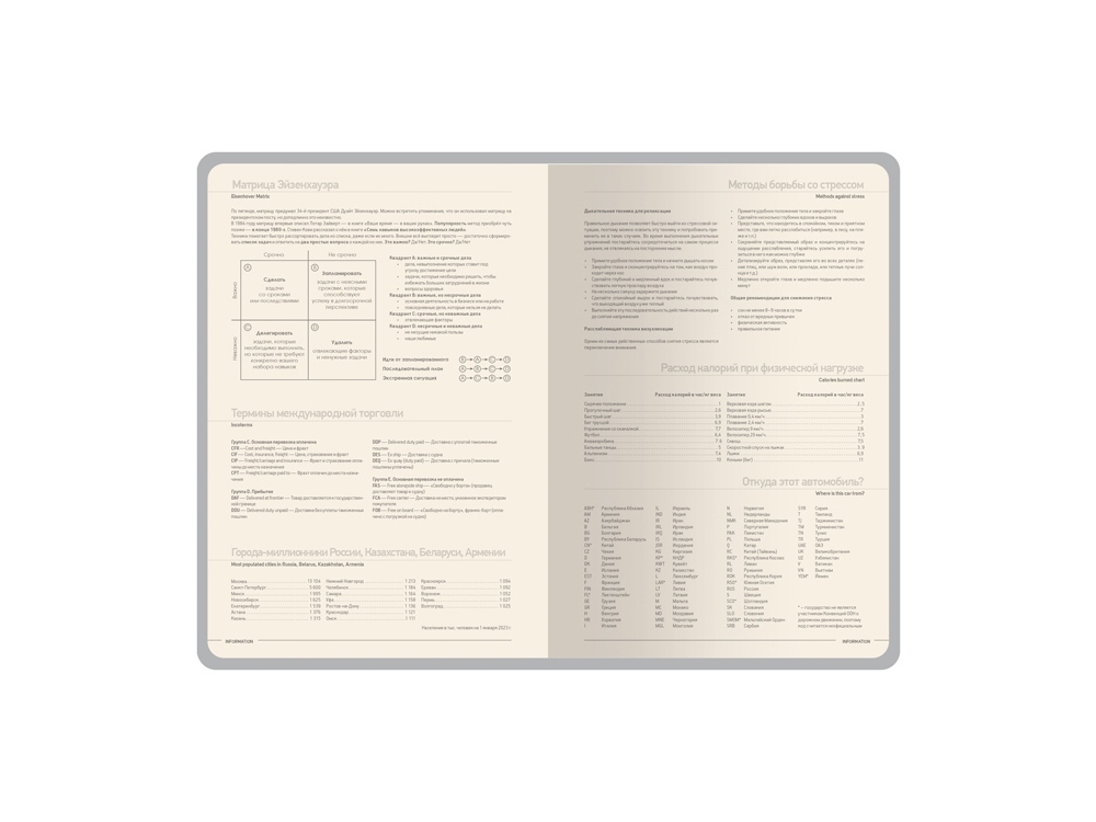 Обложка недатированного ежедневника "Megapolis Nappa Flex" ТМ Bruno Visconti произведена из искусственной кожи без применения переплетного картона, благодаря чему он легче и изящнее классических. Его можно свернуть в трубочку, обложка и блок не пострадают. При этом, для ежедневника формата А5 доступны те же опции, что и для любых других ежедневников — окрашенный обрез, крупнозернистая фактура искусственной кожи обложки, двойное ляссе 7 мм. Блок изготовлен из бежевой бумаги плотностью 70 г/м2 и помимо раздела для планирования рабочего времени включает в себя 12 страниц справочной информации.