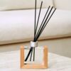 Изящный стеклянный флакон в обрамлении натурального дерева станет стильным элементом декора.