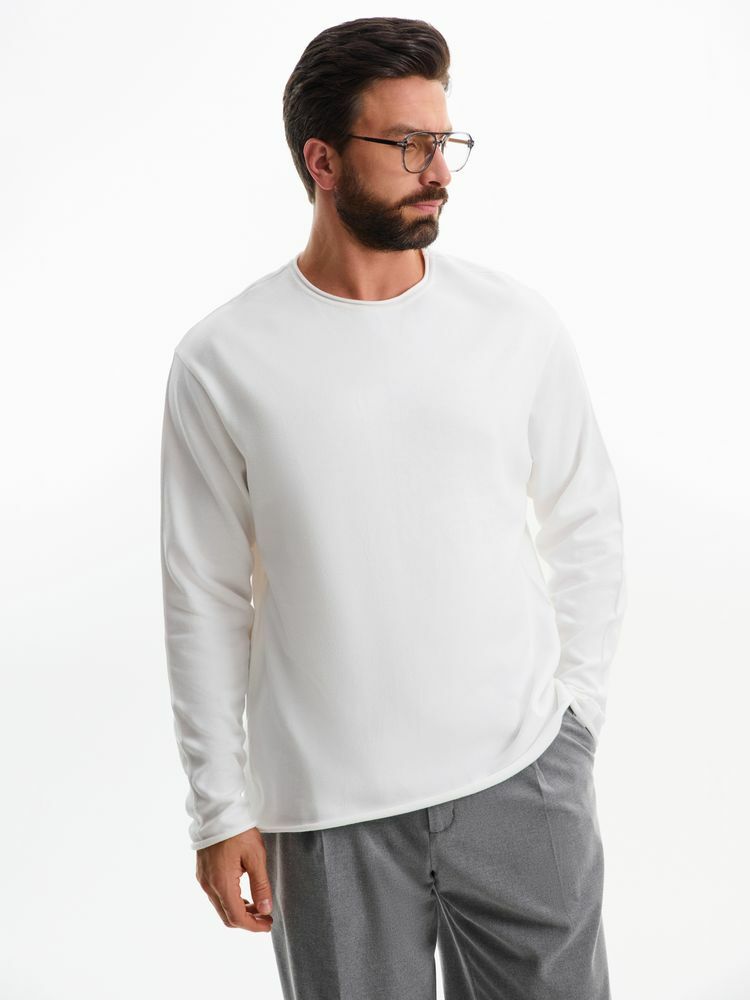 Лонгслив Fuori средней плотности с широким воротом, спущенной линией плеча и свободно подворачивающимися краями по низу, на рукавах и вороте, которые добавляют модели еще большей расслабленности. Прозрачная бирка с логотипом бренда на рукаве не нарушает минималистичности образа.