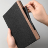 В блокноте 160 страниц в линейку кремовой бумаги плотностью 80 г/м2. Материал текстильной обложки изготовлен из переработанного (RPET) пластика. Ручка с синей пастой, стержень легко заменить.