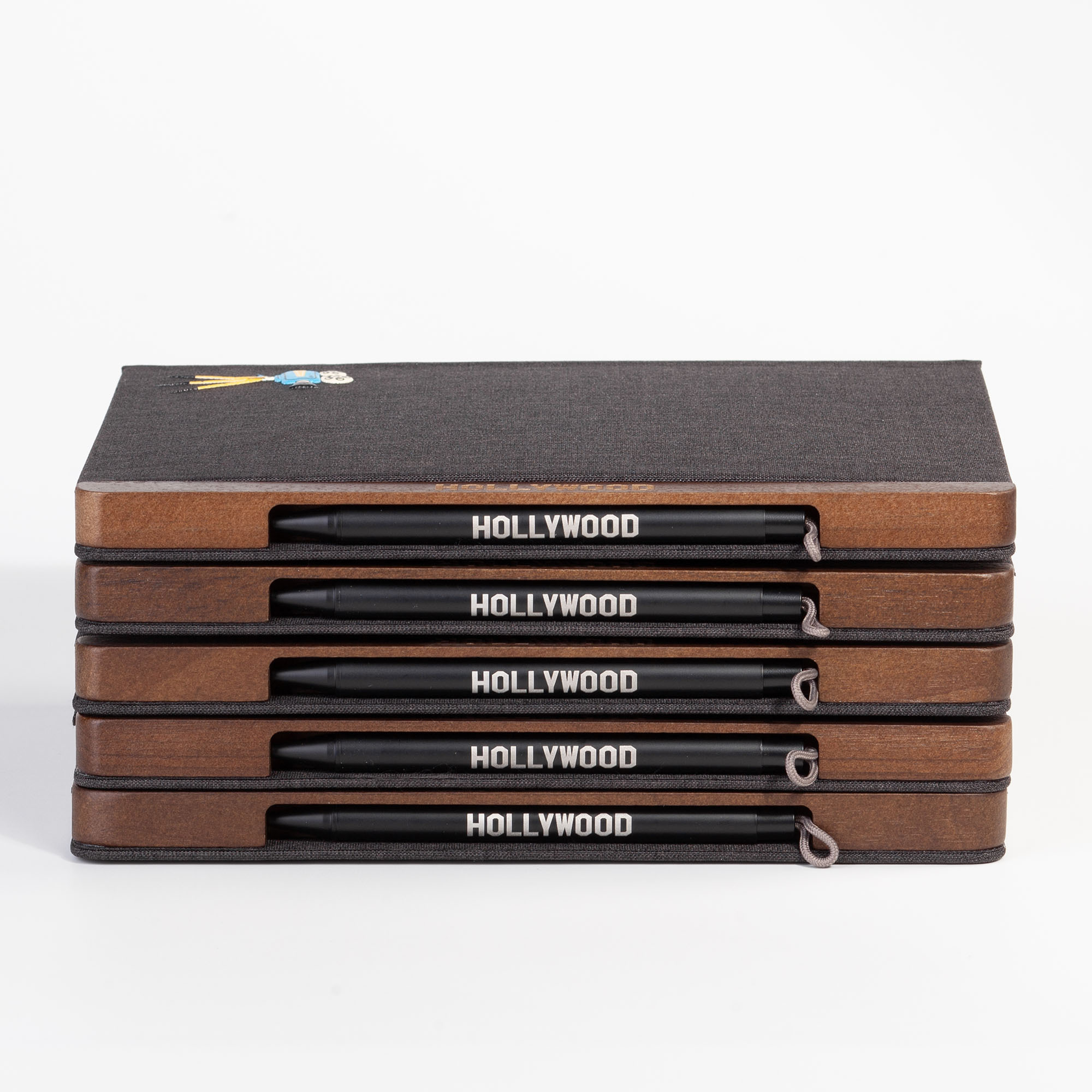 Невероятно оригинальная конструкция набора 2 в 1 - металлическая ручка скрыта и плотно держится в магнитном пенале из натурального дерева, закрепленном на обложке блокнота. При этом ручку легко извлечь, просто потянув за петельку на нажимной кнопке.