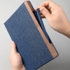 В блокноте 160 страниц в линейку кремовой бумаги плотностью 80 г/м2. Материал текстильной обложки изготовлен из переработанного (RPET) пластика. Ручка с синей пастой, стержень легко заменить.
