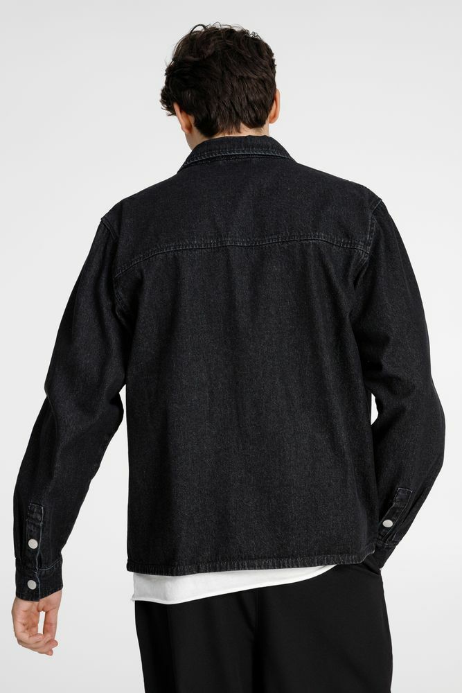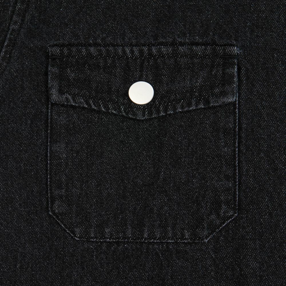 Джинсовая куртка-рубашка унисекс на кнопках прямого силуэта.