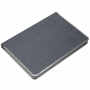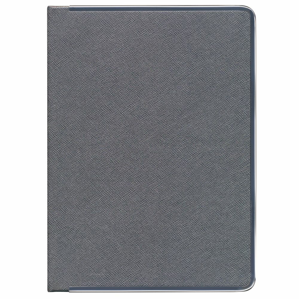 Ежедневник с твердой обложкой и серебристым обрезом, выполнен из материала Saffian, темно-серый, дополнен серым ляссе и металлическими рамками.