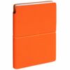 Ежедневник с гибкой обложкой выполнена из материала Nice Touch, оранжевый и Latte, оранжевый (внутренняя часть обложки), дополнен горизонтальной резинкой в цвет обложки. Внутри корешка — специальное место для крепления ручки размером до 15х1 см.