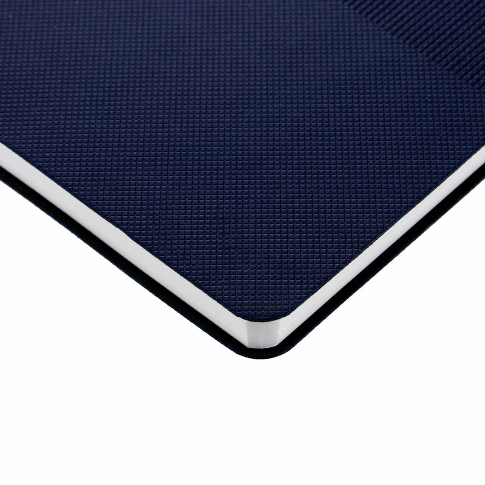 Ежедневник с гибкой обложкой, выполнен из материала Canyon, темно-синий ХХ, дополнен ляссе в цвет обложки. Блинтовое тиснение на обложке создает эффект вязаного полотна.