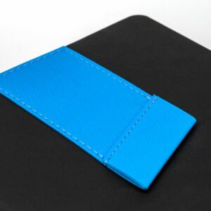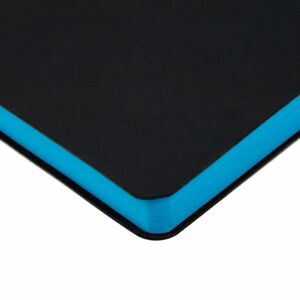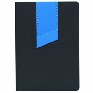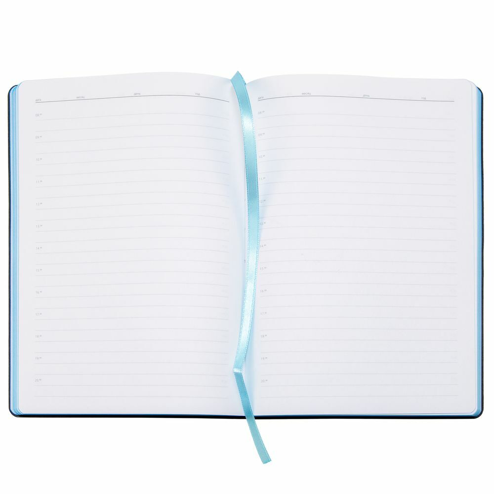 Ежедневник с гибкой обложкой, выполнен из материала Soft Touch, черный АА, дополнен петлей для ручки из материала Nice Touch, голубой JJ и цветным ляссе.