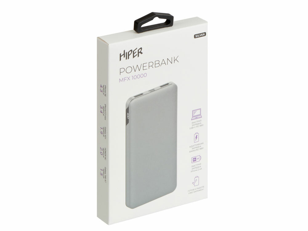 Портативный внешний аккумулятор HIPER MFX 10000 емкостью 10000 мАч (37Втч) оснащён двунаправленным портом USB-C, Micro-USB входом для зарядки, с поддержкой быстрой зарядки аккумулятора QC и PD, 2xUSB-A выходами, максимальный выходной ток 3.0А, максимальная мощность 18 Вт, поддержка быстрой зарядки стандарта QC 18 Вт, поддержка быстрой зарядки стандарта PD 18 Вт.