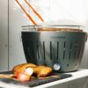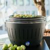 Угольный гриль округлой формы. Благодаря особой конструкции нижняя часть гриля не нагревается, его можно размещать даже на чувствительных поверхностях.