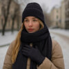 Комплект выполнен из мягкого трикотажа, что делает его особенно комфортным в носке. Вязаная шапка рибом 1х1 плотно и удобно садится по голове, сохраняя тепло и подчеркивая лаконичный стиль. Шарф из такого же материала и с аналогичной вязкой рибом 1х1 легко драпируется, позволяя носить его как свободно, так и плотно укутываясь — в зависимости от погоды и настроения. Вязаные перчатки из мягкой акриловой пряжи, также связаны резинкой 1х1. Они не только защищают от холода, но и оснащены функцией "тачскрин" на большом и указательном пальце, благодаря чему пользоваться смартфоном удобно даже на улице. Вместе шапка, шарф и перчатки создают практичный и универсальный комплект Nordend — теплый, удобный и идеально подходящий для холодного сезона.