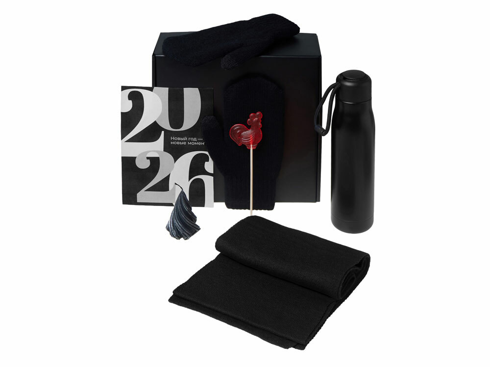 Подарочный набор с варежками, шарфом и термосом, черный в ассортименте цветов, материалов и моделей