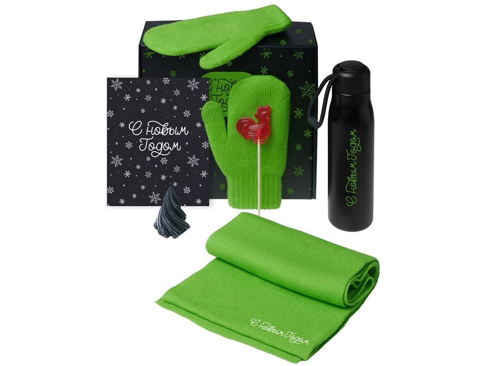 Подарочный набор с варежками, шарфом и термосом, зеленое яблоко в ассортименте цветов, материалов и моделей