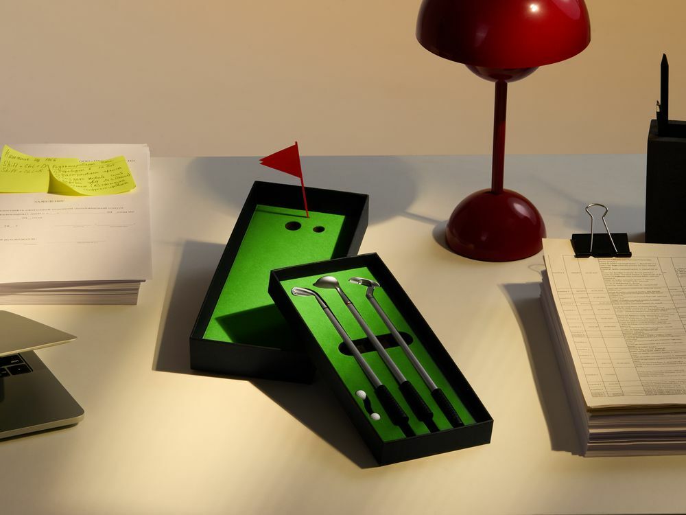 В комплекте: 3 клюшки-ручки со сменным стержнем с синими, черными и красными чернилами, 2 мячика для гольфа, флажок и подарочная коробка.Не является детской игрушкой. Не предназначено для детей!
