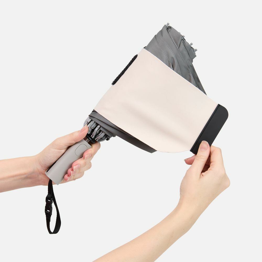 Складываясь после дождя, он прячет мокрую поверхность внутри, а сухая остается снаружи: в закрытом положении зонт не побеспокоит окружающих и не намочит одежду. Благодаря застежке на ремешке зонт удобно подвесить, например, на рюкзак.