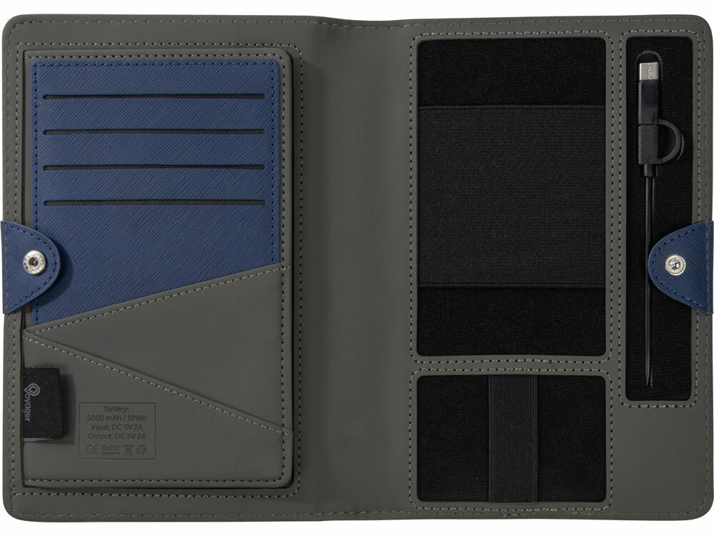 Органайзер Manner от Voyager поддерживает функции проводной и беспроводной зарядки. Беспроводная зарядка возможна с устройствами, поддерживающими стандарт Qi. Органайзер закрывается на кнопку, имеет фиксирующие резинки для проводов и других мелочей, а также большой карман, отсек для паспорта и 4 — для карточек. Для проводной зарядки предусмотрен встроенный провод. - встроенный аккумулятор 5000 мАч с беспроводной зарядкой - универсальный кабель 3-в-1 - отсеки для наиболее необходимых предметов позволяют рассортировать содержимое - высококачественный полиуретан со специальной текстурой
