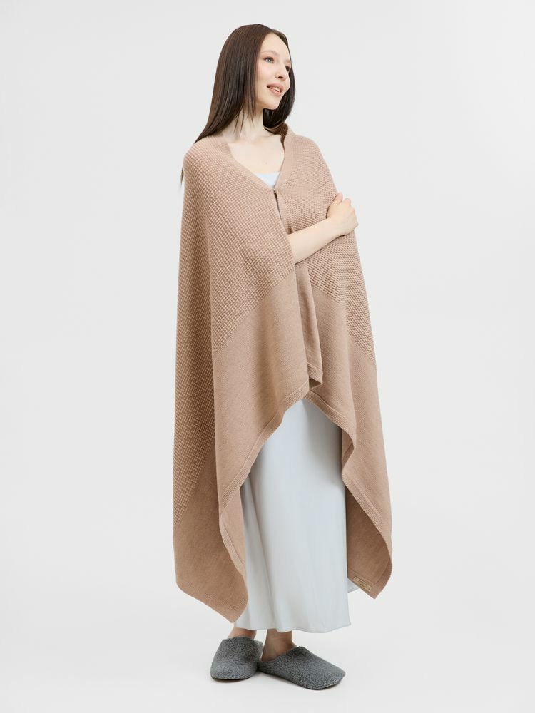 Плед Voyage соткан из мягкого сочетания шерсти и акрила — нежный, теплый и невесомый, он идеален для уютных вечеров. Кнопка позволяет превратить его в элегантную накидку, когда воздух становится прохладнее.