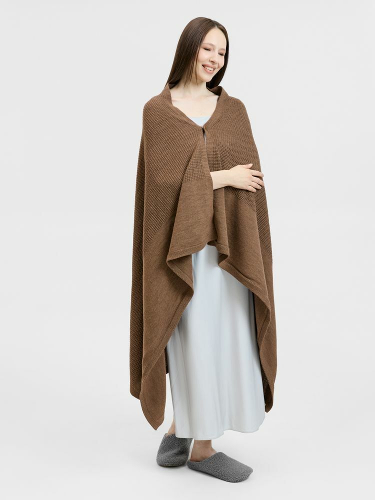Плед Voyage соткан из мягкого сочетания шерсти и акрила — нежный, теплый и невесомый, он идеален для уютных вечеров. Кнопка позволяет превратить его в элегантную накидку, когда воздух становится прохладнее.