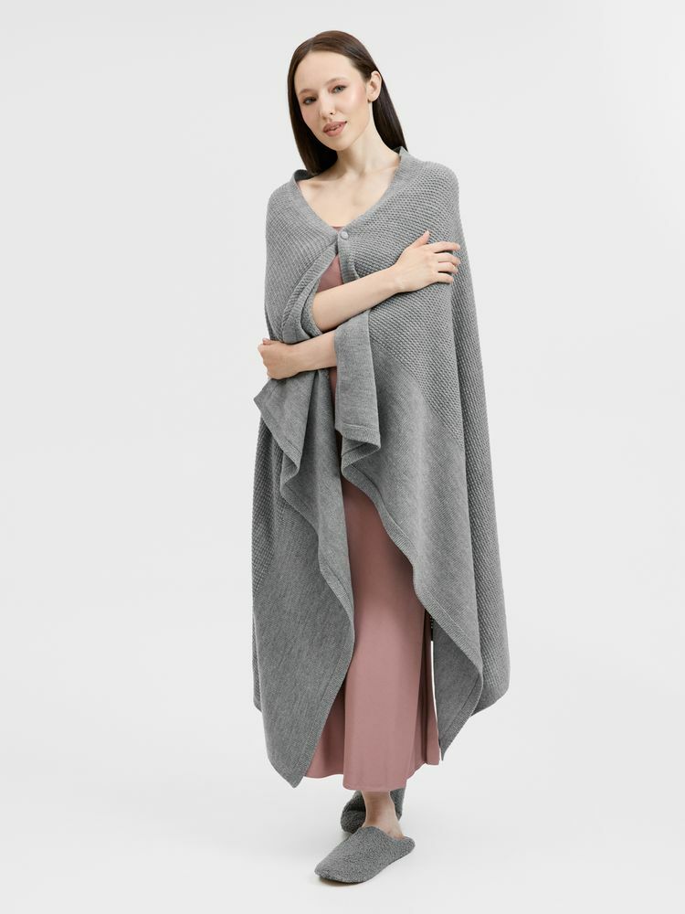 Плед Voyage соткан из мягкого сочетания шерсти и акрила — нежный, теплый и невесомый, он идеален для уютных вечеров. Кнопка позволяет превратить его в элегантную накидку, когда воздух становится прохладнее.