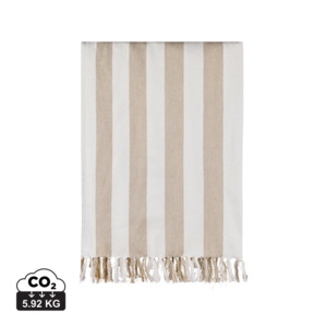 Плед Ornos с декоративной бахромой по коротким сторонам выполнен из легкой и воздушной ткани плотностью 200 г/м². Он сочетает мягкость и комфорт хлопка с преимуществами быстрой сушки, которые дает полиэстер. Благодаря большому размеру 180×180 см плед можно использовать для отдыха на пляже или в шезлонге у бассейна. Классическая сине-белая полоска — это культовый принт, ассоциирующийся с морским стилем, французским шиком и летней свежестью. Экологичность и качество: Плед сертифицирован по стандарту GRS (Global Recycled Standard). Это гарантирует, что вся цепочка поставок переработанных материалов подтверждена и сертифицирована. Состав переработанных материалов (от общего веса изделия): • 70% — переработанный хлопок, сертифицированный GRS • 29% — переработанный полиэстер, сертифицированный GRS Ключевые особенности: • Универсальность: Подходит для хамама, пляжа, бассейна и спа-процедур. • Большой размер (180×180 см): Комфортно укутаться с головой или разместиться вдвоем. • Легкое и быстро сохнущее: Воздушная ткань 200 г/м² не занимает много места в багаже и быстро высыхает. • Стильный дизайн: Декоративная бахрома по краям и классическая полоска в морском стиле. • Экологичный состав: Изготовлено из переработанных материалов с международным сертификатом GRS (99% переработанного сырья). Плед VINGA Ornos GRS — это осознанный выбор для тех, кто ценит комфорт, стиль и заботу об окружающей среде.