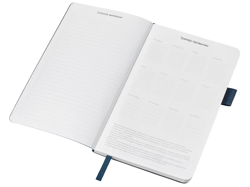 Стильный блокнот в гибкой обложке из текстурной искусственной кожи, приятной на ощупь. 96 очень приятных на ощупь листов повышенной гладкости с FSC-сертификатом обеспечивают комфортное письмо и аккуратный вид записей. Необычный для блокнота вводный блок включает трекер привычек, списки книг и фильмов, а также 4 страницы для раскрашивания с картинками и мандалами. Продуманные детали — резинка для закрытия, петля для ручки и ляссе — делают использование максимально удобным. Благодаря конверту для мелочей вам всегда будет куда положить визитки, записки и другие мелочи. Идеальный вариант для выстраивания баланса между работой и отдыхом.