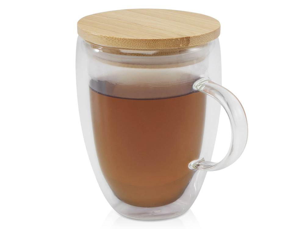 Стеклянная кружка Leona объемом 350 мл с бамбуковой крышкой - прозрачный