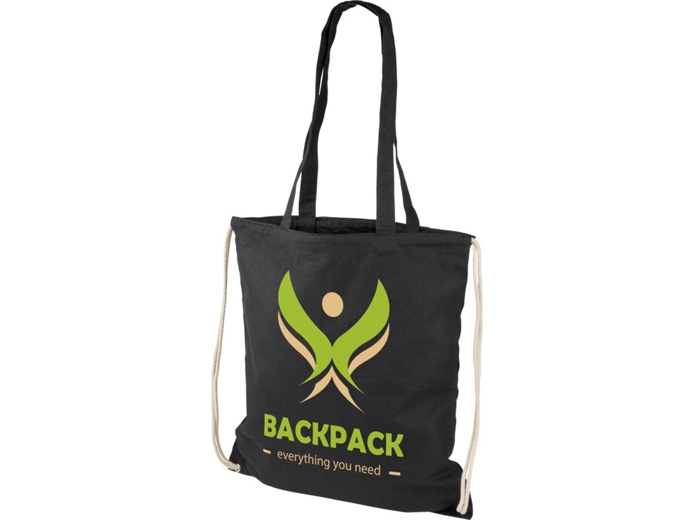 Многофункциональный хлопчатобумажный мешок с длинными ручками и затягивающим шнурком, который можно носить в качестве сумки для покупок или рюкзака. Большой основной отсек, закрывающийся затяжкой шнурка. Имеет две выпадающие ручки длиной 31 см. Вместимость: 16 л, выдерживает до 5 кг веса. Хлопок, 240 g/m2.