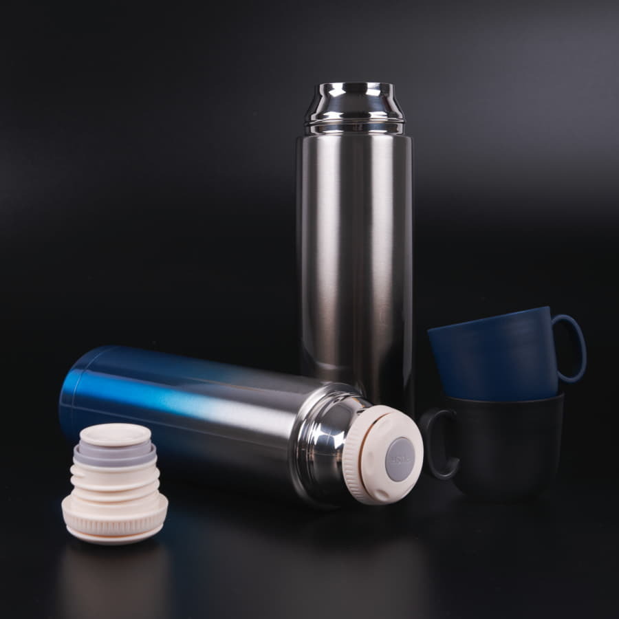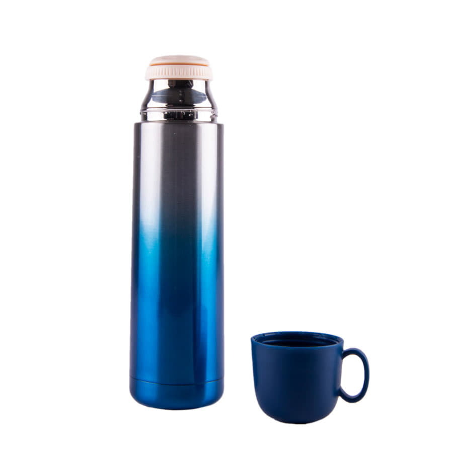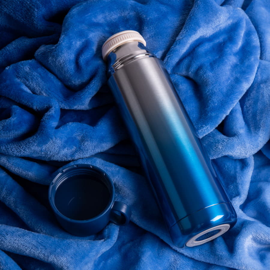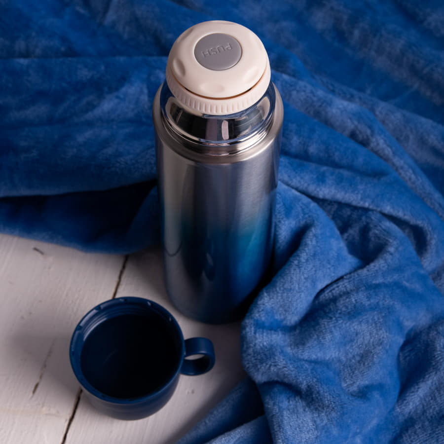 Вакуумный термос Gradient с двойными стальными стенками. Очень удобная форма крышки-чашки. Отделка - плавный градиент из серебряного в насыщенный синий цвет. Сохраняет тепло до 12 часов в зависимости от температуры окружающей среды.