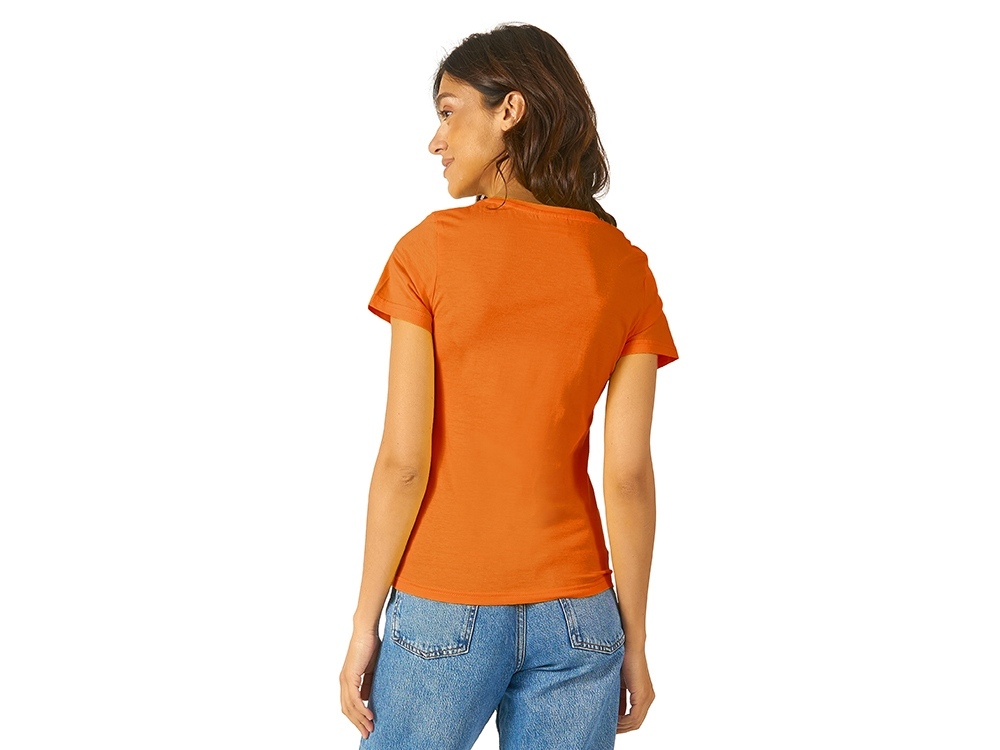 Женская футболка из натурального хлопка с элегантным V-образным вырезом. Материал отлично подходит для нанесения рекламной информации. Натуральная ткань не вызывает раздражения кожи.
