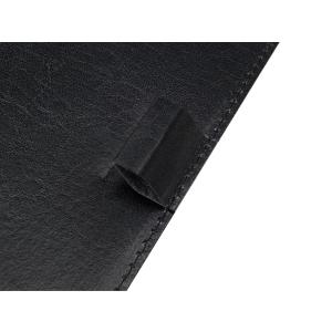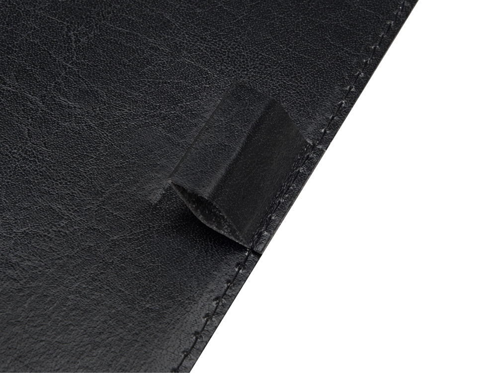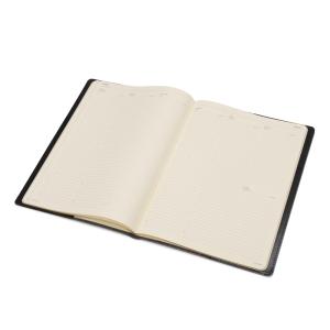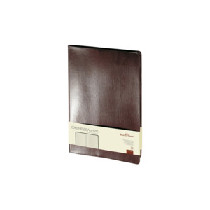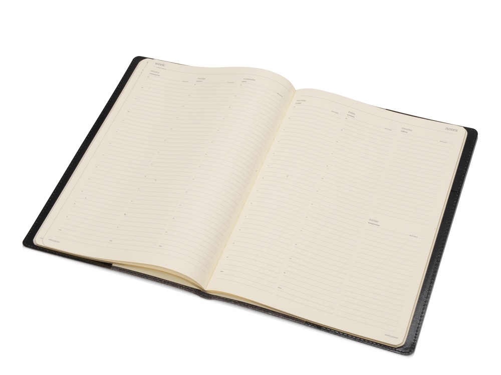 Строгий еженедельник портфолио выпускается в кожаной съемной обложке. По периметру обложки подходит строчка нитками в тон обложке. Металлизированный обрез блока окрашен под золото. Недатированный еженедельник формата А4 удобен для настольного использования. Блок для записей состоит из 128 страниц бежевой бумаги с плотностью 70 грамм. На 19 страницах размещен справочно-информационный блок с актуальными сведениями. Для размещения ручки предусмотрена кожаная петля.