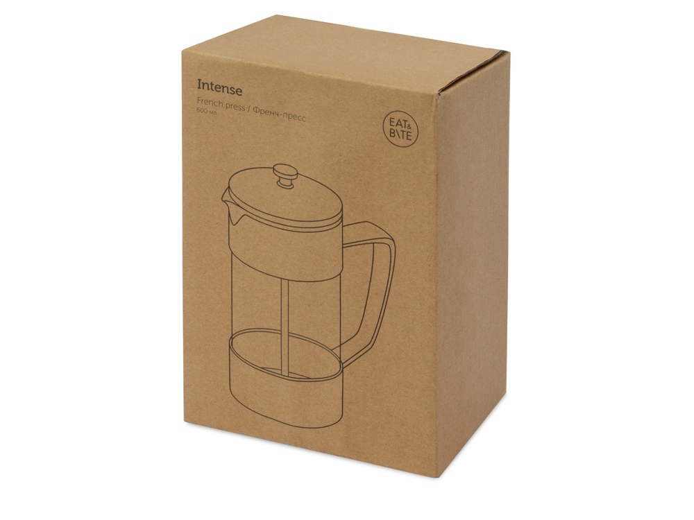 Френч-пресс «Intense» - незаменимый кухонный прибор, который подойдет для использования не только дома, но и в офисе. Легкость заваривания напитков во френч-прессе является отличным преимуществом при выборе корпоративного подарка в данной категории. - корпус из прочного пластика, емкость из жаропрочного боросиликатного стекла, устойчивого к перепадам температур - объема в 600 мл хватит минимум на 2 чашки кофе или чая - максимально рекомендованная температура воды - 120℃ - можно использовать в посудомоечной машине - не разрешается разогревать в СВЧ - значительная площадь для нанесения